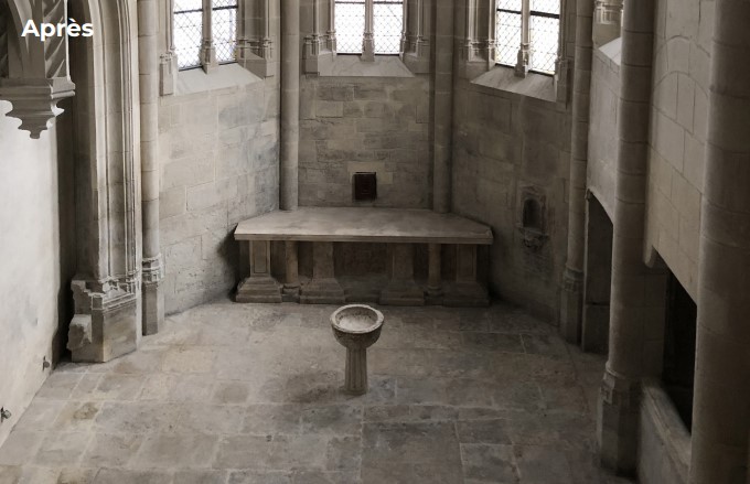 • Finaliser les travaux visant à assurer l’équilibre structurel de l’ouvrage, notamment par la remise en cohésion des larges lézardes traversantes, d’assurer une parfaite descente de charge des voûtes par la stabilisation des claveaux, des voutains et de restaurer les baies à remplages qui menacent ruine. • Remettre en valeur la chapelle par un nettoyage et une valorisation des vestiges de décors peints et sculptés.