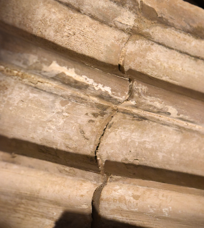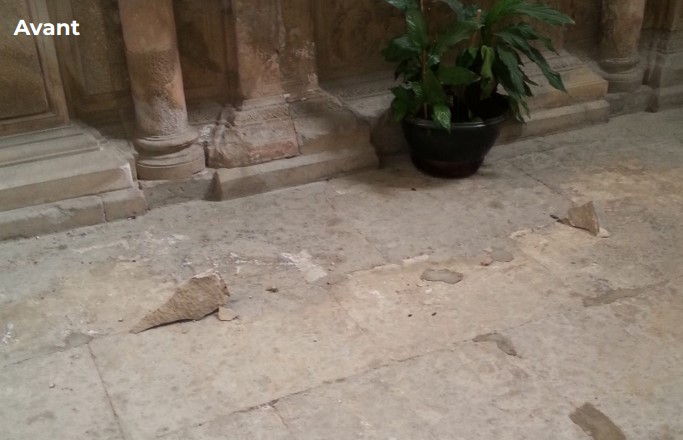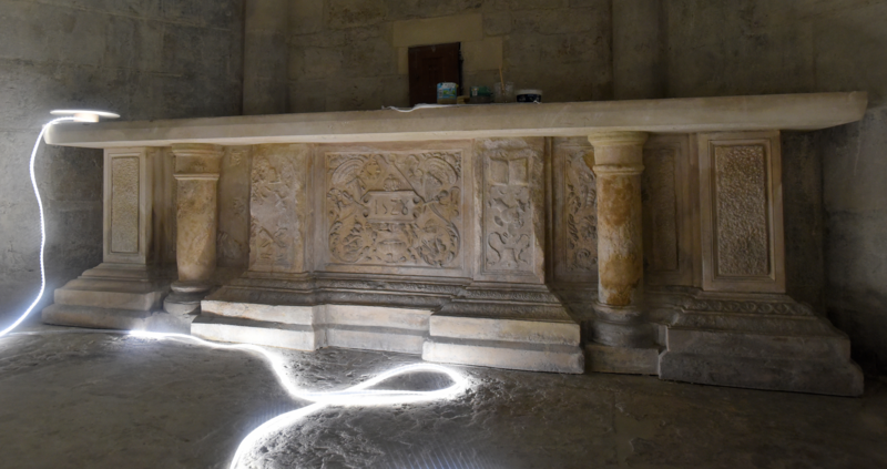 Les bases de l’autel épaufrées : pilastres et colonnes ont été retracées.