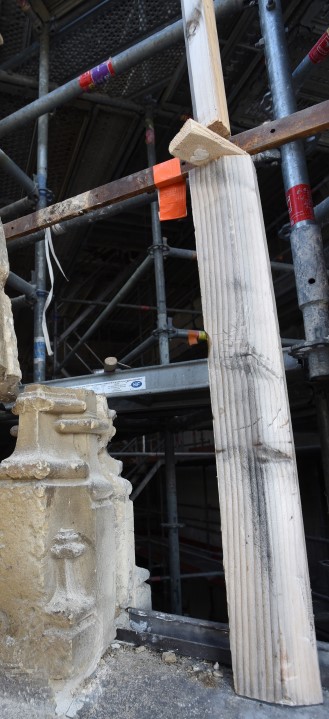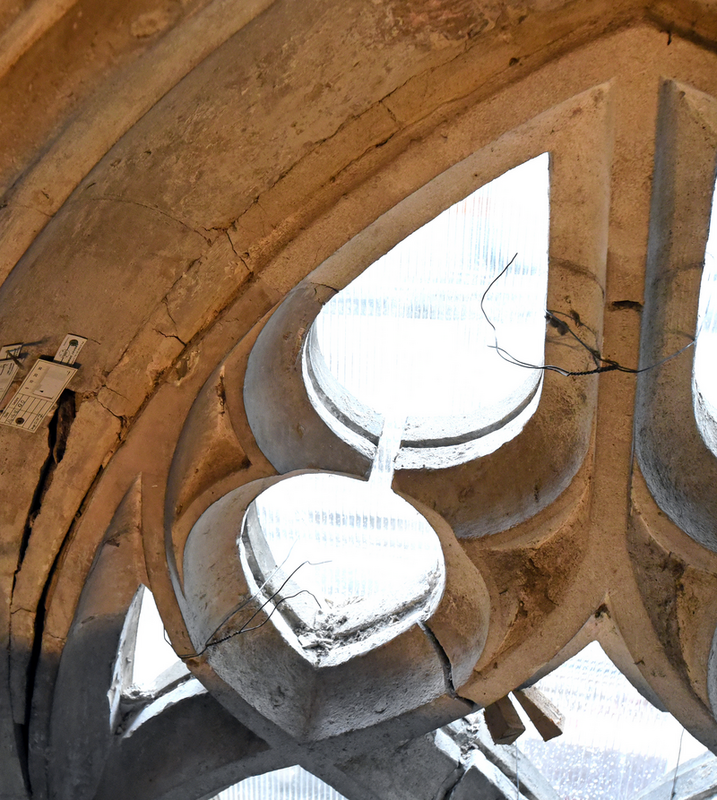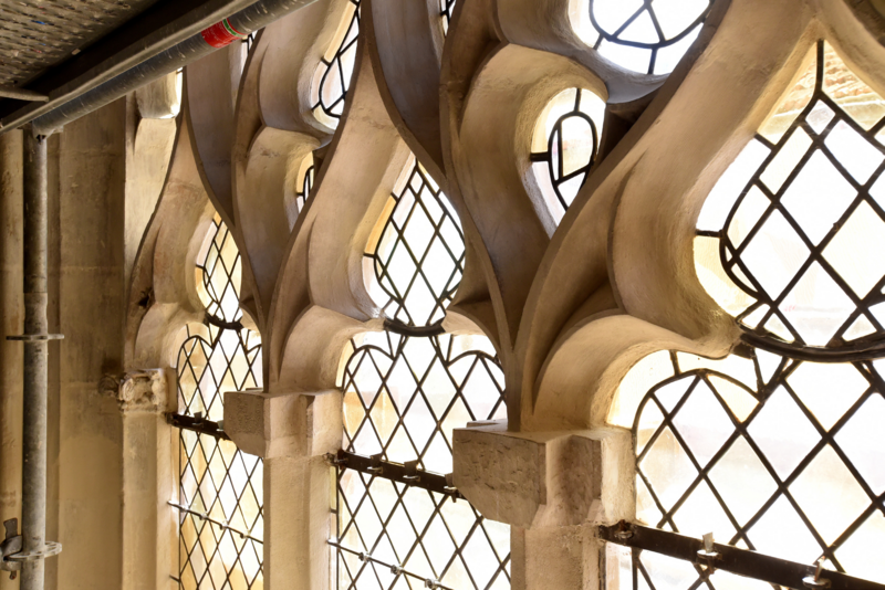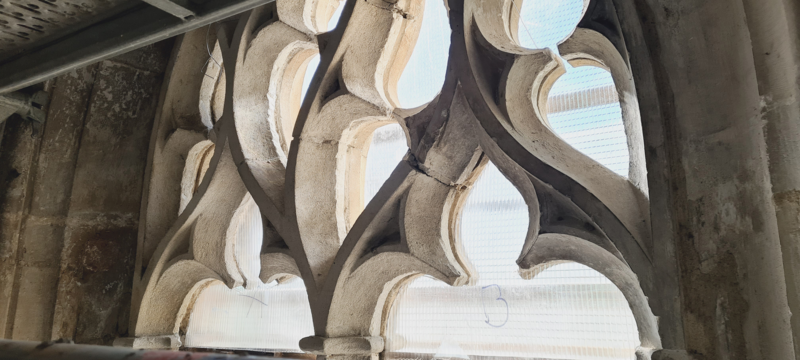 Restauration des meneaux par bouchons de pierre uniquement, en conservant les pierres en état