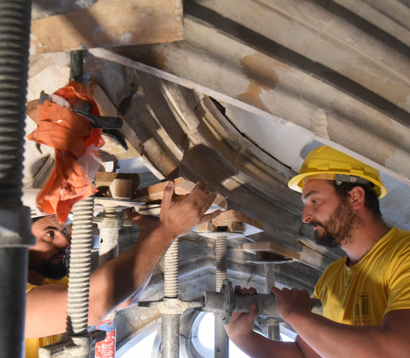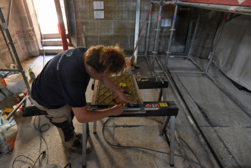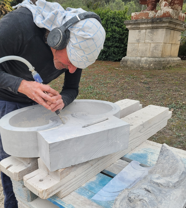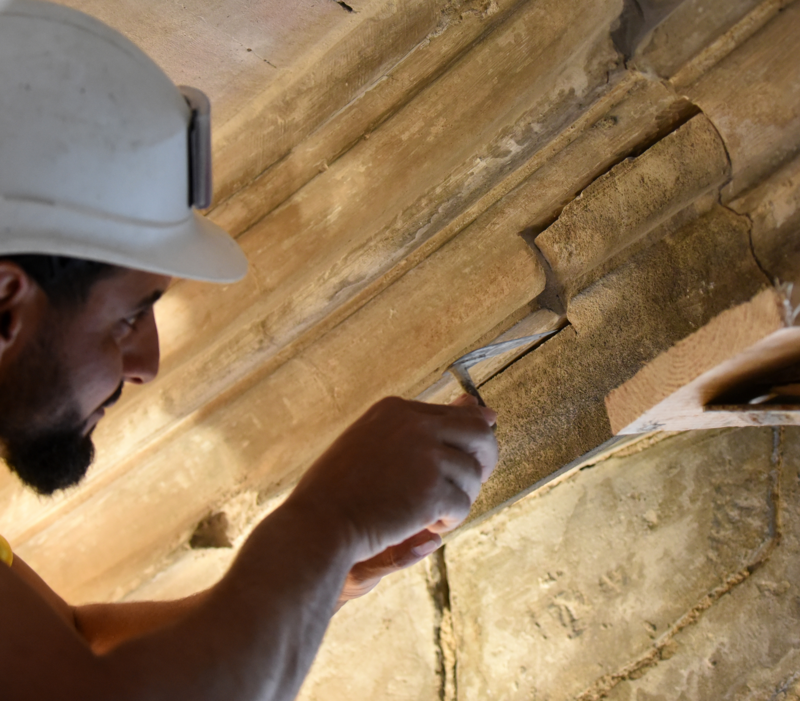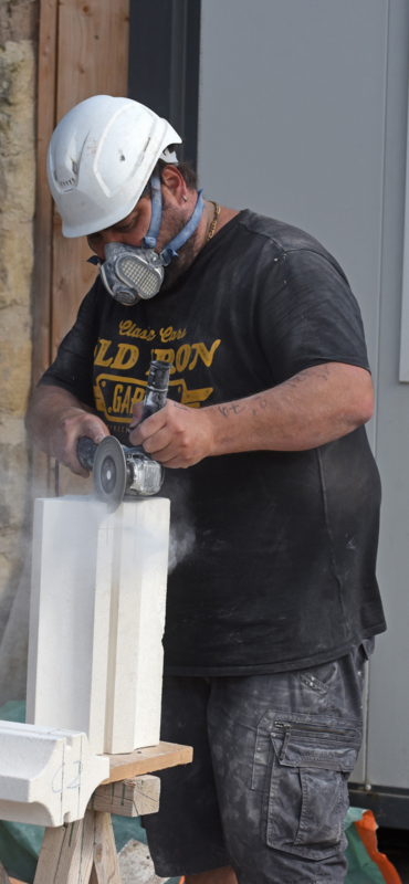 Installation de chantier, maçonnerie, pierre de taille, sculpture
